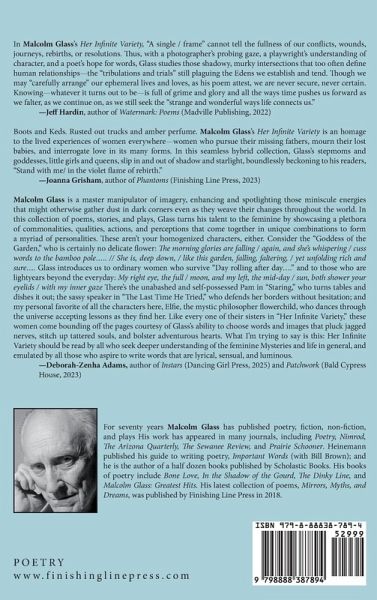 "Her Infinite Variety" is a collection of poems, stories, and plays celebrating women. Through his narratives, dramatizations, and monologues, Malcolm Glass takes his reader on a journey through the triumphs and tribulations of women and their relationships with men and other women. These pieces show women dealing with frustration and grief, making tough choices, expressing wit and sensibility, determination and confusion. The reader will find in this collection characters who are mystical and mythical, whimsical and nostalgic. "Her Infinite Variety" suggests that the depth and diversity of women extends far beyond its pages, to infinity.