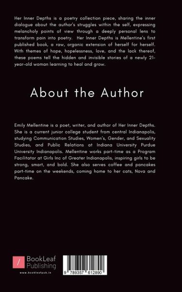 Her Inner Depths is a poetry collection piece, sharing the inner dialogue about the author's struggles within the self, expressing melancholy points of view through a deeply personal lens to transform pain into poetry. Her Inner Depths is Mellentine's first published book, a raw, organic extension of herself for herself. With themes of hope, hopelessness, love, and the lack thereof, these poems tell the hidden and invisible stories of a newly 21-year-old woman learning to heal and grow.