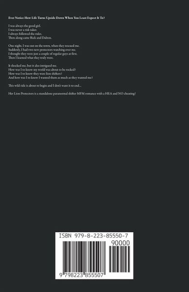 Ever Notice How Life Turns Upside Down When You Least Expect It To? I was always the good girl. I was never a risk taker. I always followed the rules. Then along came Rick and Dalton. One night, I was out on the town, when they rescued me. Suddenly, I had two new protectors watching over me. I thought they were just a couple of regular guys at first. Then I learned what they truly were. It shocked me, but it also intrigued me. How was I to know my world was about to be rocked? How was I to know they were lion shifters? And how was I to know I wanted them as much as they wanted me? This wild ride is about to begin and I don't want it to end… Her Lion Protectors is a standalone paranormal shifter MFM romance with a HEA and NO cheating!