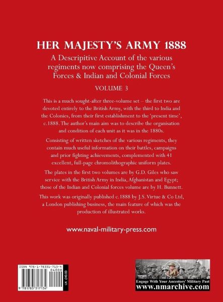 This is a much sought-after three-volume set – the first two are devoted entirely to the British Army, with the third to India and the Colonies, from their first establishment to the ‘present time’, c.1888. The author’s main aim was to describe the organisation and condition of each unit as it was in the 1880s. Consisting of written sketches of the various regiments, they contain much useful information on their battles, campaigns and prior fighting achievements, complemented with 41 excellent, full-page chromolithographic uniform plates. The plates in the first two volumes are by G.D. Giles who saw service with the British Army in India, Afghanistan and Egypt; those of the Indian and Colonial forces volume are by H. Bunnett. This work was originally published c.1888 by J.S. Virtue & Co Ltd, a London publishing business, the main feature of which was the production of illustrated works.