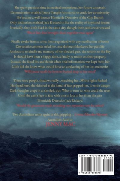 Her Mind SCREAM MURDER: Crime Fiction Thriller of Psychological Suspense, Homicide Murder, Mystery and Romance by Australian Author Jenny Mac'A memory lost, a past buried. A murder she was never meant to remember'She spent precious time in medical institutions, her future uncertainDetermination enabled Jenna Temple functional to study law at universityHe became a well-known Homicide Detective of the City BranchOnly dedication enabled Jack Rickard to live the reality of boyhood dreamsIronically, they both lived in the same city, though their paths never crossed'Was it fate that brought them together once again'Finally awake from a coma, Jenna agonized with any recollection of homeDissociative amnesia ruled her, and darkness blanketed her past lifeAnxious to re-kindle any memory of her blocked past, she returns to the BayIt should have been a happy time, a family re-union on their propertyInstead, she faced lies and deceit when vital information was kept from herLittle did she know what would force an awakening of her lost memories'Will Jenna recall the horrors buried deep in her mind' There were people, shadows really...watching her...White lights flashedHer head hurt, she shivered as the hand of fear gripped her, to sense dangerDark thoughts crept in as she fled, but: Who to turn to, who could she trustUntil she came face to face with one so lost to her from the pastHomicide Detective Jack Rickard'Would the gruesome truth revealing two mysteries now be solved'Two Australians unite again in this gripping Psychological/Murder/Mystery/ThrillerIf you love Psychological Thrillers, gripping Suspense, secrets & Romance, this page-turner is for youAustralian Author JENNY MAC