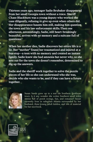 Showing up from the dead is best done in person... Thirteen years ago, teenager Sadie Brubaker disappeared from her small Georgia town without a trace. Sheriff Chase Blackburn was a young deputy who worked the case diligently, refusing to give up even when others did. Her disappearance haunts him still, making him question the town and his law enforcement skills. Then one afternoon, astonishingly, Sadie, still heart-breakingly beautiful, arrives with no memory and a suitcase full of questions. When her mother dies, Sadie discovers her entire life is a lie. Her "mother" found her traumatized and injured at a bus stop-a teen with no memory and created an instant family. Sadie knew she had amnesia but never why, so she sets out for the town she doesn't remember, determined to dig up the answers. Sadie and the sheriff work together to solve the puzzle pieces of her life so she can understand who she was, decide who she wants to be, and if they can have a future together.