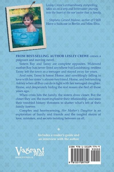 From best-selling author Lesley Crewe comes a poignant and moving novel. Sisters Bay and Tansy are complete opposites. Widowed mother Bay has never lived anywhere but Louisbourg; restless Tansy left the town as a a teenager and stayed away for years. And now, Tansy is home. Home, and unwittingly falling in love with her sister's almost-boyfriend. Home, and befriending Ashley when all Bay can do is fight with her teenaged daughter. Home, and desperately hiding the real reason she fled all those years ago. When crisis hits the family, the sisters draw closer. But the closer they are, the more explosive their relationship, and soon their troubled history threatens to shatter what's left of their family forever. Complex and heartwarming, Her Mother's Daughter is an exploration of family and friends and the tangled skeins of love, mistakes, and secrets twisting between us all.