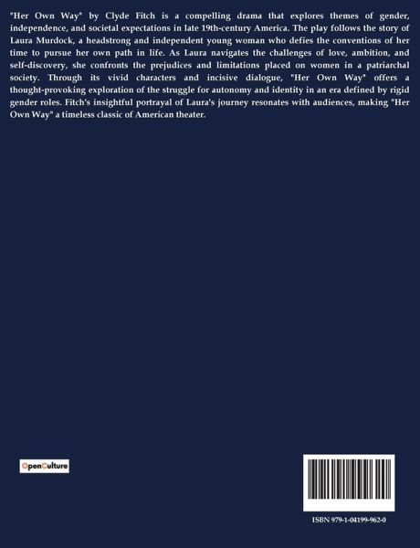 "Her Own Way" by Clyde Fitch is a compelling drama that explores themes of gender, independence, and societal expectations in late 19th-century America. The play follows the story of Laura Murdock, a headstrong and independent young woman who defies the conventions of her time to pursue her own path in life. As Laura navigates the challenges of love, ambition, and self-discovery, she confronts the prejudices and limitations placed on women in a patriarchal society. Through its vivid characters and incisive dialogue, "Her Own Way" offers a thought-provoking exploration of the struggle for autonomy and identity in an era defined by rigid gender roles. Fitch's insightful portrayal of Laura's journey resonates with audiences, making "Her Own Way" a timeless classic of American theater.