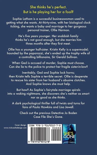 She thinks he's perfect. But is he playing her for a fool? A successful businesswoman... Sophie Latham is a problem solver who's used to getting what she wants. At thirty-nine, her biological clock is ticking, and she wants a baby. Marriage to her gorgeous personal trainer, Ollie Harmon, seems like the perfect solution. Despite their brief, three-month relationship and her mother's concerns, Sophie is determined to go ahead with or without her family's blessing. A fragile new sister-in-law... Sophie is shocked to learn that Ollie has a younger half-sister he's never mentioned. Kristin Kelly is a supermodel and the trophy wife of abusive and controlling billionaire, Sir Gerald Sullivan. Ollie is desperate to rescue his sister, and Sophie knows she must help. A web of lies... When Sullivan is accused of murder, Detective Jo Boden of the Major Investigations Team is determined to get to the truth. But can Sophie lie to the police to protect her new sister-in-law? As Sophie fights to stay in control, her perfect marriage spirals into a nightmare. She must face the truth about herself and how far she'll go for the man she loves. A dark psychological thriller full of twists and turns. Readers love Susan Wilkins' crime thrillers: 'Well plotted and unflinchingly told.' Sunday Express 'Murder, corruption and a crafted plot make for a fine read.' The Sun 'This stylish, clever crime story never lets up... Blazingly brilliant.' Sunday Mirror 'Dark and gripping from first page to last, this is Susan Wilkins at her nail-biting best.' Jessie Keane 'I was engaged from the very first chapter... Brilliant.' Goodreads reviewer, ¿¿¿¿¿
