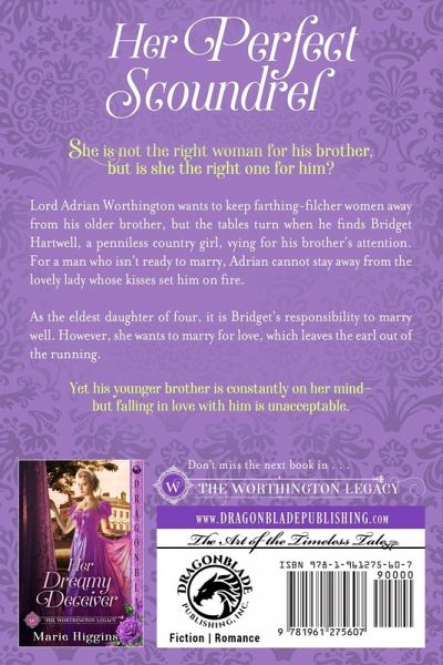 She is not the right woman for his brother, but is she the right one for him? Lord Adrian Worthington wants to keep farthing-filcher women away from his older brother, but the tables turn when he finds Bridget Hartwell, a penniless country girl, vying for his brother's attention. For a man who isn't ready to marry, Adrian cannot stay away from the lovely lady whose kisses set him on fire. As the eldest daughter of four, it is Bridget's responsibility to marry well. However, she wants to marry for love, which leaves the earl out of the running. Yet his younger brother is constantly on her mind-but falling in love with him is unacceptable. Note: This series is part of Dragonblade's Sweet Dreams line, so this is a sweet, wholesome Historical Romance where passion beyond the bedroom door is left to the reader's imagination. The Worthington Legacy Book 1 - Her Perfect Scoundrel Book 2 - Her Dreamy Deceiver Book 3 - Her Adorable Cad Book 4 - Her Irresistible Charmer Book 5 - Her Captain Enchanter