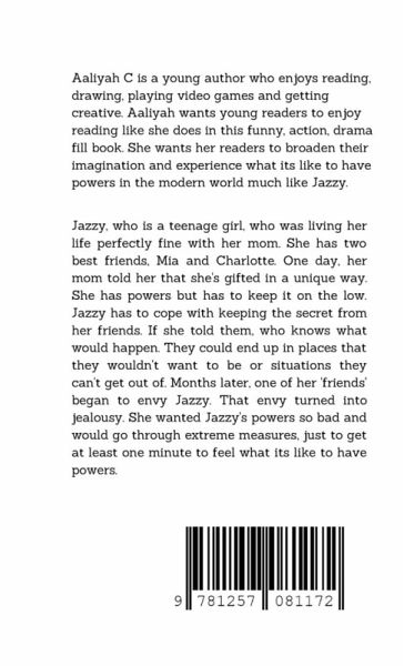 Jazzy, who is a teenage girl, who was living her life perfectly fine with her mom. She has two best friends, Mia and Charlotte. One day, her mom told her that she's gifted in a unique way. She has powers but has to keep it on the low. Jazzy has to cope with keeping the secret from her friends. If she told them, who knows what would happen. They could end up in places that they wouldn't want to be or situations they can't get out of. Months later, one of her 'friends' began to envy Jazzy. That envy turned into jealousy. She wanted Jazzy's powers so bad and would go through extreme measures, just to get at least one minute to feel what its like to have powers.