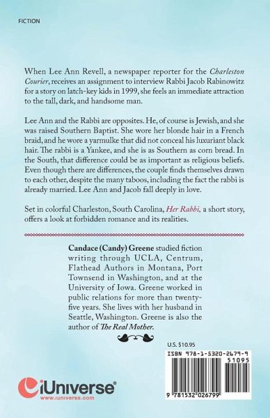 When Lee Ann Revell, a newspaper reporter for the Charleston Courier, receives an assignment to interview Rabbi Jacob Rabinowitz for a story on latch-key kids in 1999, she feels an immediate attraction to the tall, dark, and handsome man. Lee Ann and the Rabbi are opposites. He, of course is Jewish, and she was raised Southern Baptist. She wore her blonde hair in a French braid, and he wore a yarmulke that did not conceal his luxuriant black hair. The rabbi is a Yankee, and she is as Southern as corn bread. In the South, that difference could be as important as religious beliefs. Even though there are differences, the couple finds themselves drawn to each other, despite the many taboos, including the fact the rabbi is already married. Lee Ann and Jacob fall deeply in love. Set in colorful Charleston, South Carolina, Her Rabbi, a short story, offers a look at forbidden romance and its realities.