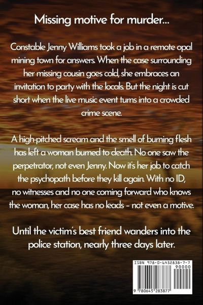 Missing motive for murder... Constable Jenny Williams took a job in a remote opal mining town for answers. When the case surrounding her missing cousin goes cold, she embraces an invitation to party with the locals. But the night is cut short when the live music event turns into a crowded crime scene. A high-pitched scream and the smell of burning flesh has left a woman burned to death. No one saw the perpetrator, not even Jenny. Now it's her job to catch the psychopath before they kill again. With no ID, no witnesses and no one coming forward who knows the woman, her case has no leads - not even a motive. Until the victim's best friend wanders into the police station, nearly three days later.