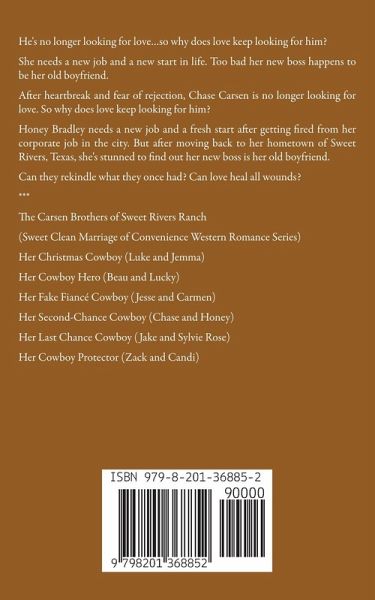 He's no longer looking for love…so why does love keep looking for him? She needs a new job and a new start in life. Too bad her new boss happens to be her old boyfriend. After heartbreak and fear of rejection, Chase Carsen is no longer looking for love. So why does love keep looking for him? Honey Bradley needs a new job and a fresh start after getting fired from her corporate job in the city. But after moving back to her hometown of Sweet Rivers, Texas, she's stunned to find out her new boss is her old boyfriend. Can they rekindle what they once had? Can love heal all wounds? *** The Carsen Brothers of Sweet Rivers Ranch (Sweet Clean Marriage of Convenience Western Romance Series) Her Christmas Cowboy (Luke and Jemma) Her Cowboy Hero (Beau and Lucky) Her Fake Fiancé Cowboy (Jesse and Carmen) Her Second-Chance Cowboy (Chase and Honey) Her Last Chance Cowboy (Jake and Sylvie Rose) Her Cowboy Protector (Zack and Candi)