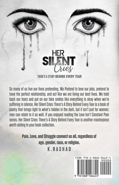 So many of us live our lives pretending. We Pretend to love our jobs, pretend to have the perfect relationship, and act like we are living our best lives. We hold back our tears and put on our fake smiles like everything is okay when we're suffering in silence. Her Silent Cries: There's A Story Behind Every Tear is a book of poetry that brings light to what's hidden in the dark, but it isn't just for women; men can relate to it as well. If you enjoyed reading the Love Isn't Constant Pain series. Her Silent Cries: There's A Story Behind Every Tear is another masterpiece worth adding to your book collection. Pain, Love, and Struggle connect us all, regardless of age, gender, race, or religion. K.Rashad