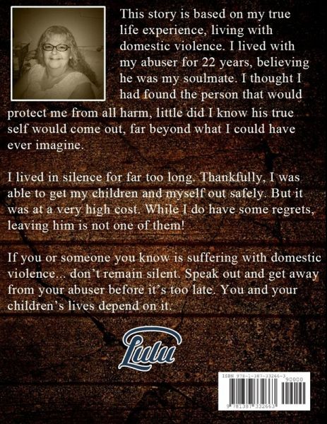 This story is based on my true life experience, living with domestic violence. I lived with my abuser for 22 years, believing he was my soulmate. I thought I had found the person that would protect me from all harm, little did I know that his true self would come out, far beyond what I could ever imagine. I lived in silence for far too long. Thankfully, I was able to get my children and myself out safely. But it was at a very high cost. While I do have some regrets, leaving him is not one of them! If you or someone you know is suffering with domestic violence... don't remain silent. Speak out and get away from your abuser before it's too late. You and your children's lives depend on it.