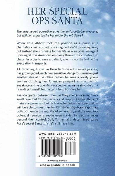 The sexy secret operative gave her unforgettable pleasure, but will he return to kiss her under the mistletoe? When Rose Abbott took the position as a nurse at a charitable clinic abroad, she imagined she'd be saving lives, but instead she's running for her life as a surprise insurgent uprising at the American embassy throws the country into chaos. In order to save a patient, she misses the last of the evacuation transports and has to make her own way to find her brother. She's only prevented from walking into a trap by the massive soldier who rises out of the sand like a sexy specter. T.J. Browning, known as Hook to his select special ops crew, has been growing jaded, so that each new sensitive, dangerous mission has become just another day at the office. When he sees a lovely young woman clutching her American passport as she tries to sneak across the open landscape, he knows he shouldn't risk revealing himself, but he can't help but save her. Passion ignites between them as they shelter overnight in a small cave, but T.J. has secrets and responsibilities. He can't make any promises, but he leaves her with the hope that he will be able to meet her for Christmas. Doubts creep in for both of them in the months of separation, and the road to a potential reunion is made even rockier by circumstances beyond their control. Still, T.J. remains determined to be Rose's secret Santa...if she'll still have him.