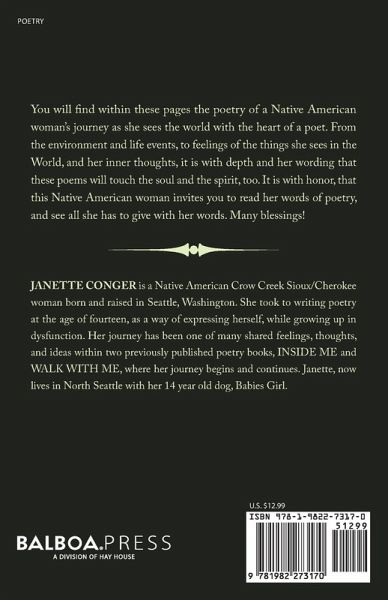 You will find within these pages the poetry of a Native American woman's journey as she sees the world with the heart of a poet. From the environment and life events, to feelings of the things she sees in the World, and her inner thoughts, it is with depth and her wording that these poems will touch the soul and the spirit, too. It is with honor, that this Native American woman invites you to read her words of poetry, and see all she has to give with her words. Many blessings!