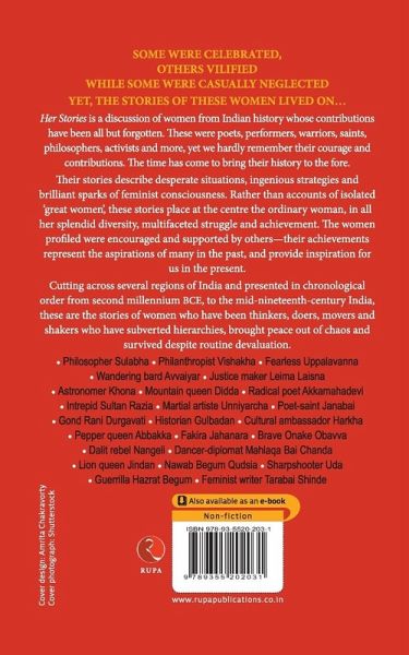 Some were celebrated, Others vilified While some were casually neglected Yet, the story of these women lived on Her-Stories is a discussion of women from Indian history whose contributions have been all but forgotten. These were poets, performers, warriors, saints, philosophers, activists and more, yet we hardly remember their courage and contributions. The time has come to bring their history to the fore. Their stories describe desperate situations, ingenious strategies and brilliant sparks of feminist consciousness. Rather than accounts of isolated 'great women', these stories place at the centre the ordinary woman, in all her splendid diversity, multifaceted struggle and achievement. The women profiled were encouraged and supported by others-their achievements represent the aspirations of many in the past, and provide inspiration for us in the present. Cutting across several regions of India and presented in chronological order from second millennium BCE, to the mid-nineteenth century India, these are the stories of women who have been thinkers, doers, movers and shakers who have subverted hierarchies, brought peace out of chaos and survived despite routine devaluation. Philosopher Sulabha, philanthropist Vishakha, fearless Uppalavanna, wandering bard Auvaiyar, justice maker Leima Laisna, astronomer Khona, mountain queen Didda, radical poet Akkamahadevi, intrepid Sultan Razia, martial artiste Unniyarcha, poet-saint Janabai, Gond Rani Durgavati, historian Gulbadan, cultural ambassador Harkha, pepper queen Abbakka, fakira Jahanara, brave Onake Obavva, Dalit rebel Nangeli, dancer-diplomat Mahlaqa Bai Chanda, lion queen Jindan, Nawab Begum Qudsia, sharpshooter Uda, guerrillera Hazrat Begum and feminist writer Tarabai Shinde.