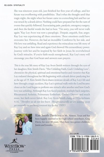 She was nineteen years old, just finished her first year of college, and her future was overflowing with possibilities. That's what she thought until that tragic night, the night when her future came to a screeching halt and her car was struck by a drunk driver. Nothing could have prepared her for the turn of events that quickly followed. Excruciating pain, paralysis, emergency surgery, and then the fateful words she had to hear. "I'm sorry, you will never walk again."Kay Loy Avers was now a paraplegic. Despair, anguish, fear, anger. Kay Loy was experiencing all these emotions. These emotions could have overcome her. However, she had an incredible Comforter by her side, and His love was unfailing. Read and experience the miraculous true life story of Kay Loy and see how time and again God showed His extraordinary power. Journey with her and be inspired by her faith in Jesus; be overwhelmed by God's miracles. If you're faith needs strengthened, Kay Loy's story will encourage you that God hears and answers ours prayers. This is the true life story of Kay Loy Avers Smith written through the eyes of her daughter, Kim Smith Davis. "Her Unfailing Faith, God's Unfailing Love", chronicles the physical, spiritual and emotional battles and victories that Kay Loy endured throughout her life beginning with a drunk driver paralyzing her at the age of 19. Kim Smith Davis shares intimate details of Kay Loy's life and how through a tragic accident, Kay Loy's spiritual walk with the Lord became closer as the Lord began to perform one miracle after another and how God's love was unfailing. Although Kay Loy faced paralysis, multiple back surgeries, Rheumatoid Arthritis, Pulmonary Embolism, Crohn's Disease, and much more, her faith never failed. Kay Loy Avers Smith clung to 2 Corinthians 4:16. "Therefore we do not lose heart. Though outwardly we are wasting away yet inwardly we are being renewed day by day."(NIV)