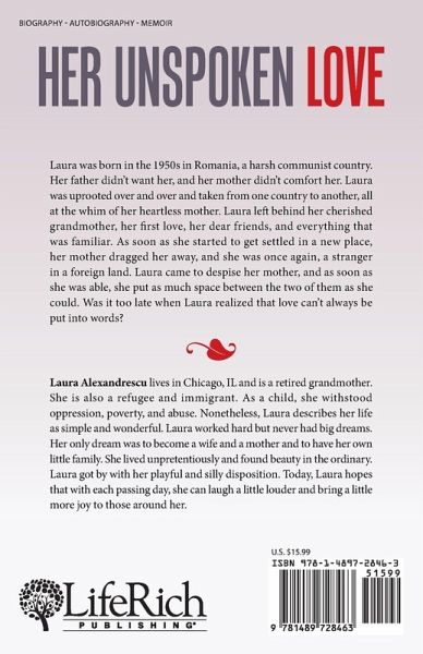 Laura was born in the 1950s in Romania, a harsh communist country. Her father didn't want her, and her mother didn't comfort her. Laura was uprooted over and over and taken from one country to another, all at the whim of her heartless mother. Laura left behind her cherished grandmother, her first love, her dear friends, and everything that was familiar. As soon as she started to get settled in a new place, her mother dragged her away, and she was once again, a stranger in a foreign land. Laura came to despise her mother, and as soon as she was able, she put as much space between the two of them as she could. Was it too late when Laura realized that love can't always be put into words?