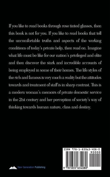 If you like to read books through rose tinted glasses, then this book is not for you. If you like to read books that tell the uncomfortable truths and aspects of the working conditions of today's private help, then read on. Imagine what life must be like for our nation's privileged and elite and then discover the stark and incredible accounts of being employed in some of their homes. The life styles of the rich and famous is very much a reality but the attitudes towards and treatment of staff is in sharp contrast. This is a modern woman's memoirs of private domestic service in the 21st century and her perception of society's way of thinking towards human nature, class and destiny.