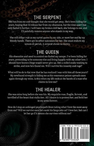 Special Edition: All green pages. The Serpent: A Serpent shows no mercy. She thought she could get away, hiding for years, hoping that I'd release her from my obsession. But I will have my broken doll back. She is mine, and I'll destroy anyone who blocks my path to her. Isabella, my cartel queen, will once again rule by my side. Or risk meeting her bloody end by my villainous hands. There are no other outcomes for her. She will endure my venom or perish. The Queen: Queens bow to no one. His obsession blinded him and helped fuel my escape. I've been hiding for years, pretending to be someone else. Living the life I was supposed to with my other love. But I should've known Diego would never give up. He's a coiled snake waiting to strike. Now that he's found me, I fear I won't survive his insanity and rage. The Healer: Sometimes, love means letting go. She was mine long before she was his. My exquisite rose, fragile, delicate, and horrified by the beast who stalks her. I vow to protect her and shield her forever. But her unhinged psychopath is determined to take what I love the most away from me. If he sinks his fangs into her again, we may not live to see another day. If I set her free, I can ensure both our survival, even if it means selling our souls to the very devil we hide from. Please see the author's website for CWs. This is a dark romance intended for adult audiences.