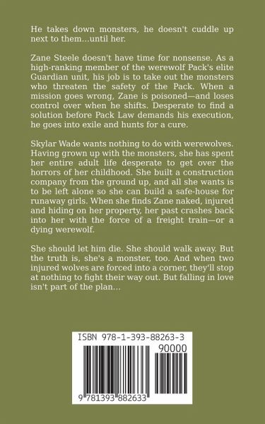 He takes down monsters, he doesn't cuddle up next to them…until her. Zane Steele doesn't have time for nonsense. As a high-ranking member of the werewolf Pack's elite Guardian unit, his job is to take out the monsters who threaten the safety of the Pack. When a mission goes wrong, Zane is poisoned-and loses control over when he shifts. Desperate to find a solution before Pack Law demands his execution, he goes into exile and hunts for a cure. Skylar Wade wants nothing to do with werewolves. Having grown up with the monsters, she has spent her entire adult life desperate to get over the horrors of her childhood. She built a construction company from the ground up, and all she wants is to be left alone so she can build a safe-house for runaway girls. When she finds Zane naked, injured and hiding on her property, her past crashes back into her with the force of a freight train-or a dying werewolf. She should let him die. She should walk away. But the truth is, she's a monster, too. And when two injured wolves are forced into a corner, they'll stop at nothing to fight their way out. But falling in love isn't part of the plan…