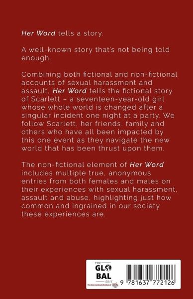Her Word tells a story. A well-known story that's not being told enough. Combining both fictional and non-fictional accounts of sexual harassment and assault, Her Word tells the fictional story of Scarlett - a seventeen-year-old girl whose whole world is changed after a singular incident one night at a party. We follow Scarlett, her friends, family and others who have all been impacted by this one event as they navigate the new world that has been thrust upon them. The non-fictional element of Her Word includes multiple true, anonymous entries from both females and males on their experiences with sexual harassment, assault and abuse, highlighting just how common and ingrained in our society these experiences are.