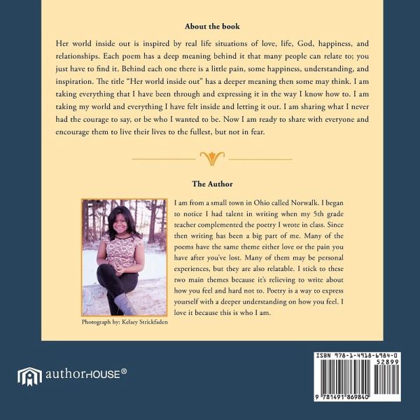 About the book Her world inside out is inspired by real life situations of love, life, God, happiness, and relationships. Each poem has a deep meaning behind it that many people can relate to; you just have to find it. Behind each one there is a little pain, some happiness, understanding, and inspiration. The title "Her world inside out" has a deeper meaning then some may think. I am taking everything that I have been through and expressing it in the way I know how to. I am taking my world and everything I have felt inside and letting it out. I am sharing what I never had the courage to say, or be who I wanted to be. Now I am ready to share with everyone and encourage them to live their lives to the fullest, but not in fear.