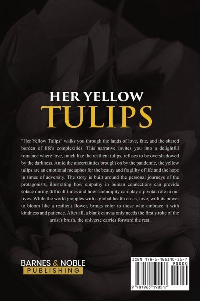 "Her Yellow Tulips" leads you through a landscape of love, fate, and the shared burdens of life's complexities. This enchanting romance captures a love that, like resilient tulips, thrives even in the shadows. Set against the uncertainties of the pandemic, the yellow tulips serve as a poignant symbol of life's fragility, as well as the hope and trust that sustain us during times of adversity. The story unfolds around the protagonists' personal journeys, showing how empathy and human connection provide solace in trying times, while serendipity guides their paths in unexpected ways. As the world grapples with a global health crisis, love blooms with the resilience of a flower, bringing color to those who embrace it with kindness and patience. Just as a blank canvas only needs the first stroke of the artist's brush, the universe carries on from there. So, dear reader, embark on this journey with an open heart, and savor every moment along the way.