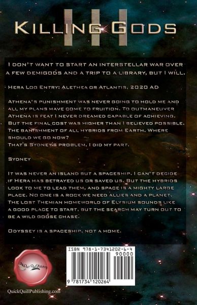 I don't want to start an interstellar war over a few demigods and a trip to a library, but I will. Hera Log Entry: Alethea or Atlantis, 2020 AD Athena's punishment was never going to hold me and all my plans have come to fruition. To outmaneuver Athena is feat I never dreamed capable of achieving. But the final cost was higher than I believed possible. The banishment of all hybrids from Earth. Where should we go now? That's Sydney's problem, I did my part. Sydney It was never an island but a spaceship. I can't decide if Hera has betrayed us or saved us. But the hybrids look to me to lead them, and space is a mighty large place. No one is a rock we need allies and a planet. The lost Themian homeworld of Elysium sounds like a good place to start, but the search may turn out to be a wild goose chase. Odyssey is a spaceship, not a home.