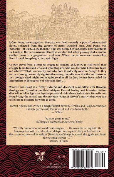 Before being sewn-together, Heraclix was dead—merely a pile of mismatched pieces, collected from the corpses of many troubled men. And Pomp was immortal—at least, so she thought. That was before her impossible near-murder at the hands of the necromancer, Heraclix's creator. But when playing God, even the smallest error is a gargantuan weakness. When the necromancer makes his, Heraclix and Pomp begin their epic flight. As they travel from Vienna to Prague to Istanbul and, even, to Hell itself, they struggle to understand who and what they are: who was Heraclix before his death and rebirth? What is mortality, and why does it suddenly concern Pomp? As they journey through an unruly eighteenth century, they discover that the necromancer they thought dead might not be quite so after all. In fact, he may have sealed his immortality at the expense of everyone alive . . . Heraclix and Pomp is a richly textured and decadent read, filled with Baroque ideology and Byzantine political intrigue. Fans of fantasy and historical fiction alike will revel in Aguirre's layered prose and vivid characterizations. Heraclix and Pomp brings the surreal and the macabre to one of history's most violent eras.