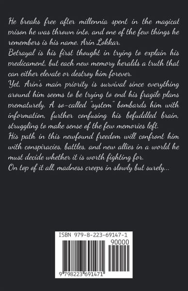 He breaks free after millennia spent in the magical prison he was thrown into, and one of the few things he remembers is his name. Arin Lokkar. Betrayal is his first thought in trying to explain his predicament, but each new memory heralds a truth that can either elevate or destroy him forever. Yet, Arin's main priority is survival since everything around him seems to be trying to end his fragile plans prematurely. A so-called "system" bombards him with information, further confusing his befuddled brain, struggling to make sense of the few memories left. His path in this newfound freedom will confront him with conspiracies, battles, and new allies in a world he must decide whether it is worth fighting for. On top of it all, madness creeps in slowly but surely...