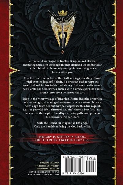 A thousand years ago, humanity's greatest heroes killed God. Now, under the brutal rule of warrior-kings, the land of Helesia has fallen to chaos. Demons stalk the deep forests, monsters roam free of their prisons beneath the World Vein, and ancient terrors rise again. History is written in blood, but the future will be forged in holy fire... Renira Washer lives the dreary life of a laundry girl, dreaming of adventure. When a stranger from her mother's past appears with a dire warning, Renira's peaceful life is shattered and she's thrown headfirst into a millennia old war between Heaven and earth. In Renira's blood, hides a secret: the angels are not all gone. Only the Herald can ring in the Fifth Age. Only the Herald can bring the God back to life. A new epic fantasy saga, where humans can steal magic and immortality by devouring angels, starts here with HERALD. Perfect for fans of Brandon Sanderson, John Gwynne, or Ryan Cahill.