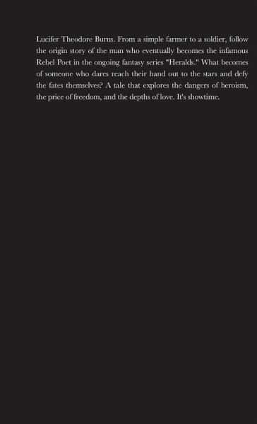 Lucifer Theodore Burns. From a simple farmer to a soldier, follow the origin story of the man who eventually becomes the infamous Rebel Poet in the ongoing fantasy series "Heralds." What becomes of someone who dares reach their hand out to the stars and defy the fates themselves? A tale that explores the dangers of heroism, the price of freedom, and the depths of love. It's showtime.