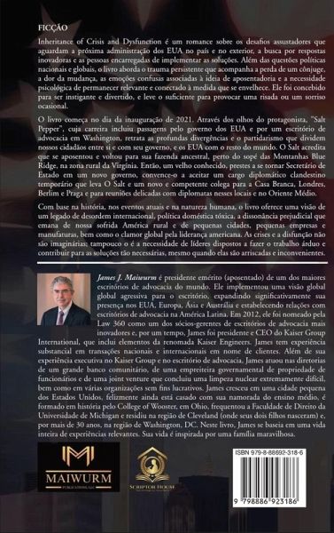 Inheritance of Crisis and Dysfunction é um romance sobre os desafios assustadores que aguardam a próxima administração dos EUA no país e no exterior, a busca por respostas inovadoras e as pessoas encarregadas de implementar as soluções. Além das questões políticas nacionais e globais, o livro aborda o trauma persistente que acompanha a perda de um cônjuge, a dor da mudança, as emoções confusas associadas à ideia de aposentadoria e a necessidade psicológica de permanecer relevante e conectado à medida que se envelhece. Ele foi concebido para ser instigante e divertido, e leve o suficiente para provocar uma risada ou um sorriso ocasional. O livro começa no dia da inauguração de 2021. Através dos olhos do protagonista, "Salt Pepper", cuja carreira incluiu passagens pelo governo dos EUA e por um escritório de advocacia em Washington, retrata as profundas divergências e o partidarismo que dividem nossos cidadãos entre si e com seu governo, e os EUA com o resto do mundo. O Salt acredita que se aposentou e voltou para sua fazenda ancestral, perto do sopé das Montanhas Blue Ridge, na zona rural da Virgínia. Então, um velho conhecido, prestes a se tornar Secretário de Estado em um novo governo, convence-o a aceitar um cargo diplomático clandestino temporário que leva O Salt e um novo e competente colega para a Casa Branca, Londres, Berlim e Praga e para reuniões delicadas com diplomatas nesses locais e no Oriente Médio. Com base na história, nos eventos atuais e na natureza humana, o livro oferece uma visão de um legado de desordem internacional, política doméstica tóxica, a dissonância prejudicial que emana de nossa sofrida América rural e de pequenas cidades, pequenas empresas e manufaturas, bem como o clamor global pela liderança americana. As crises e a disfunção não são imaginárias; tampouco o é a necessidade de líderes dispostos a fazer o trabalho árduo e contribuir para as soluções tão necessárias, mesmo quando elas são arriscadas e inconvenientes.