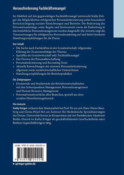 Die Suche nach Fachkräften in der Sozialwirtschaft: Allgemeine Klärung der Zusammenhänge des Themas.- Spezifika der Sozialwirtschaft inkl. Fachkräftemangel.- Der Prozess der Personalbeschaffung.- Personalrekrutierung und Recruiting Tools.- Aktuelle Entwicklungen der externen Personalrekrutierung allgemein sowie sozialwirtschaftlicher Unternehmen.- Handlungsempfehlungen für Betriebspraktiker.