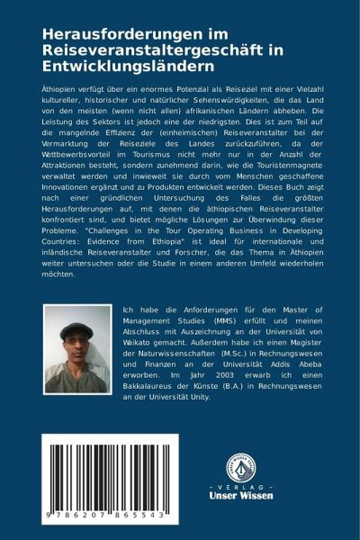Äthiopien verfügt über ein enormes Potenzial als Reiseziel mit einer Vielzahl kultureller, historischer und natürlicher Sehenswürdigkeiten, die das Land von den meisten (wenn nicht allen) afrikanischen Ländern abheben. Die Leistung des Sektors ist jedoch eine der niedrigsten. Dies ist zum Teil auf die mangelnde Effizienz der (einheimischen) Reiseveranstalter bei der Vermarktung der Reiseziele des Landes zurückzuführen, da der Wettbewerbsvorteil im Tourismus nicht mehr nur in der Anzahl der Attraktionen besteht, sondern zunehmend darin, wie die Touristenmagnete verwaltet werden und inwieweit sie durch vom Menschen geschaffene Innovationen ergänzt und zu Produkten entwickelt werden. Dieses Buch zeigt nach einer gründlichen Untersuchung des Falles die größten Herausforderungen auf, mit denen die äthiopischen Reiseveranstalter konfrontiert sind, und bietet mögliche Lösungen zur Überwindung dieser Probleme. "Challenges in the Tour Operating Business in Developing Countries: Evidence from Ethiopia" ist ideal für internationale und inländische Reiseveranstalter und Forscher, die das Thema in Äthiopien weiter untersuchen oder die Studie in einem anderen Umfeld wiederholen möchten.