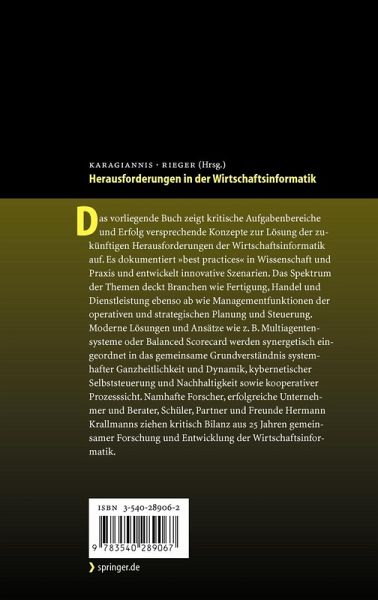 Das vorliegende Buch zeigt kritische Aufgabenbereiche und Erfolg versprechende Konzepte zur Lösung der zukünftigen Herausforderungen der Wirtschaftsinformatik auf. Es dokumentiert "best practices" in Wissenschaft und Praxis und entwickelt innovative Szenarien. Das Spektrum der Themen deckt Branchen wie Fertigung, Handel und Dienstleistung ebenso ab wie Managementfunktionen der operativen und strategischen Planung und Steuerung. Moderne Lösungen und Ansätze wie z.B. Multiagentensysteme oder Balanced Scorecard werden synergetisch eingeordnet in das gemeinsame Grundverständnis systemhafter Ganzheitlichkeit und Dynamik, kybernetischer Selbststeuerung und Nachhaltigkeit sowie kooperativer Prozesssicht. Namhafte Forscher, erfolgreiche Unternehmer und Berater, Schüler, Partner und Freunde Hermann Krallmanns ziehen kritisch Bilanz aus 25 Jahren gemeinsamer Forschung und Entwicklung der Wirtschaftsinformatik.