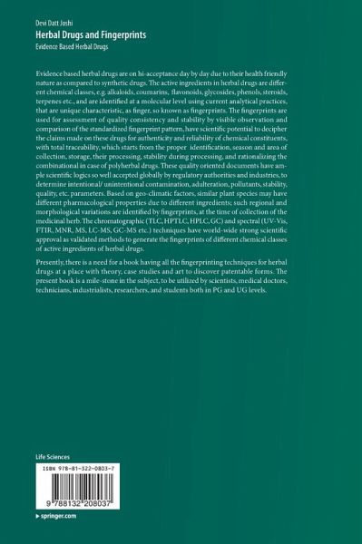 Evidence based herbal drugs are on hi-acceptance day by day due to health friendly nature compared to synthetic drugs. The active ingredients in herbal drugs are different chemical classes, e.g. alkaloids, coumarins, flavonoids, glycosides, phenols, steroids, terpenes etc., are identified at molecular level using current analytical practices, which are unique characteristic, as finger, so known as fingerprints. The fingerprints are used for assessment of quality consistency and stability by visible observation and comparison of the standardized fingerprint pattern, have scientific potential to decipher the claims made on these drugs for authenticity and reliability of chemical constituents, with total traceability, which starts from the proper identification, season and area of collection, storage, their processing, stability during processing, and rationalizing the combinational in case of polyherbal drugs. These quality oriented documents have ample scientific logics so well accepted globally by regulatory authorities and industries, to determine intentional/ unintentional contamination, adulteration, pollutants, stability, quality, etc. parameters. Based on geo-climatic factors, a same plant species has different pharmacological properties due to different ingredients; such regional and morphological variations are identified by fingerprints, at the time of collection of the medicinal herb. The chromatographic (TLC, HPTLC, HPLC, GC,) and spectral (UV-Vis., FTIR, MNR, MS, LC-MS, GC-MS etc.) techniques have world-wide strong scientific approval as validated methods to generate the fingerprints of different chemical classes of active ingredients of herbal drugs.Presently there is a need for a book having all the fingerprinting techniques for herbal drugs at a place with theory, case studies and art to discover patentable forms. The present book is a mile stone in the subject, to be utilized by Scientists, Medical Doctors, Technicians, Industrialists, Researchers, and Students both in PG and UG levels.