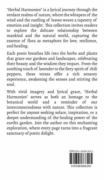 "Herbal Harmonies" is a lyrical journey through the verdant realms of nature, where the whispers of the wind and the rustling of leaves weave a tapestry of emotion and insight. This collection invites readers to explore the delicate relationship between mankind and the natural world, capturing the essence of flora as metaphors for love, resilience, and healing. Each poem breathes life into the herbs and plants that grace our gardens and landscapes, celebrating their beauty and the wisdom they impart. From the soothing touch of lavender to the fiery spirit of chili peppers, these verses offer a rich sensory experience, awakening the senses and stirring the soul. With vivid imagery and lyrical grace, "Herbal Harmonies" serves as both an homage to the botanical world and a reminder of our interconnectedness with nature. This collection is perfect for anyone seeking solace, inspiration, or a deeper understanding of the healing power of the earth's garden. Join the author on this enchanting exploration, where every page turns into a fragrant sanctuary of poetic delight.