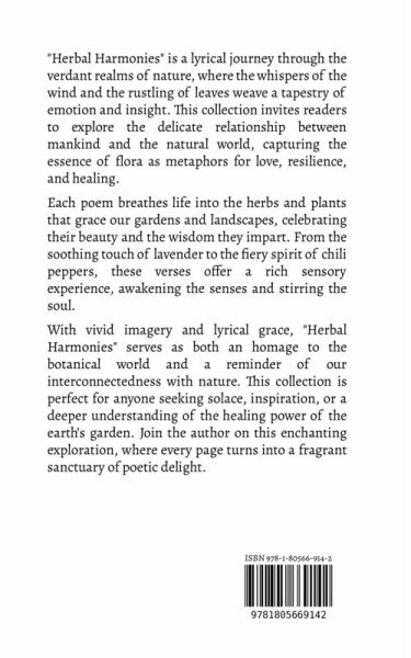 "Herbal Harmonies" is a lyrical journey through the verdant realms of nature, where the whispers of the wind and the rustling of leaves weave a tapestry of emotion and insight. This collection invites readers to explore the delicate relationship between mankind and the natural world, capturing the essence of flora as metaphors for love, resilience, and healing. Each poem breathes life into the herbs and plants that grace our gardens and landscapes, celebrating their beauty and the wisdom they impart. From the soothing touch of lavender to the fiery spirit of chili peppers, these verses offer a rich sensory experience, awakening the senses and stirring the soul. With vivid imagery and lyrical grace, "Herbal Harmonies" serves as both an homage to the botanical world and a reminder of our interconnectedness with nature. This collection is perfect for anyone seeking solace, inspiration, or a deeper understanding of the healing power of the earth's garden. Join the author on this enchanting exploration, where every page turns into a fragrant sanctuary of poetic delight.