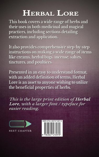 This book covers a wide range of herbs and their uses in both medicinal and magical practices, including sections detailing extraction and application. It also provides comprehensive step-by-step instructions on making a wide range of items like creams, herbal bags, incense, salves, tinctures, and poultices. Presented in an easy to understand format, with an added definition of terms, Herbal Lore is an asset to anyone wishing to utilize the beneficial properties of herbs. This is the large print edition of Herbal Lore, with a larger font / typeface for easier reading.