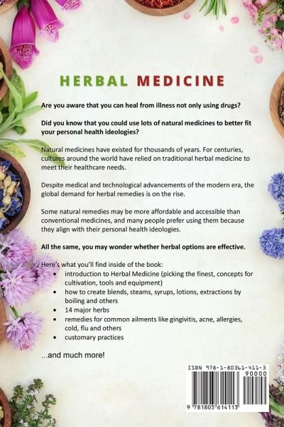 Are you aware that you can heal from illness not only using drugs? Did you know that you could use lots of natural medicines to better fit your personal health ideologies? Natural medicines have existed for thousands of years. For centuries, cultures around the world have relied on traditional herbal medicine to meet their healthcare needs. Despite medical and technological advancements of the modern era, the global demand for herbal remedies is on the rise. Some natural remedies may be more affordable and accessible than conventional medicines, and many people prefer using them because they align with their personal health ideologies. All the same, you may wonder whether herbal options are effective. Here's what you'll find inside of the book: ¿ introduction to Herbal Medicine (picking the finest, concepts for cultivation, tools and equipment) ¿ how to create blends, steams, syrups, lotions, extractions by boiling and others ¿ 14 major herbs ¿ remedies for common ailments like gingivitis, acne, allergies, cold, flu and others ¿ customary practices ...and much more!