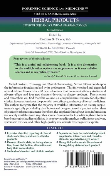 "This book consists of monographs summarizing the latest scientific findings about the toxicology and clinical pharmacology of 17 widely used herbs ... . The book's intended audience includes forensic professionals and 'researchers and clinicians interested in more context-oriented clinical information than is available in most 'herbal' references.' Chapter contents are based on original studies published in peer-reviewed journals, and written at a level for physicians, pharmacists, toxicologists, graduate students, and chemists. ... Summing Up: Recommended. All health science libraries; graduate students through professionals/practitioners." (N. Kupferberg, CHOICE, Vol. 45 (3), 2007)