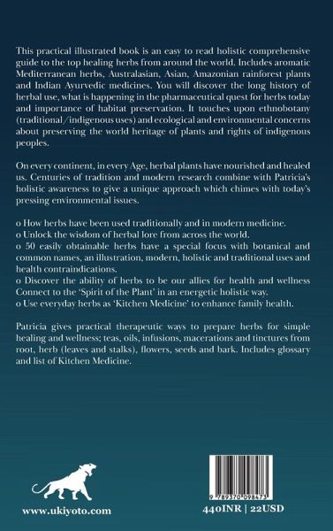This practical illustrated book is an easy to read holistic comprehensive guide to the top healing herbs from around the world. Includes aromatic Mediterranean herbs, Australasian, Asian, Amazonian rainforest plants and Indian Ayurvedic medicines. You will discover the long history of herbal use, what is happening in the pharmaceutical quest for herbs today and importance of habitat preservation. It touches upon ethnobotany (traditional/indigenous uses) and ecological and environmental concerns about preserving the world heritage of plants and rights of indigenous peoples. On every continent, in every Age, herbal plants have nourished and healed us. Centuries of tradition and modern research combine with Patricia's holistic awareness to give a unique approach which chimes with today's pressing environmental issues. oHow herbs have been used traditionally and in modern medicine. oUnlock the wisdom of herbal lore from across the world. o50 easily obtainable herbs have a special focus with botanical and common names, an illustration, modern, holistic and traditional uses and health contraindications. oDiscover the ability of herbs to be our allies for health and wellness. Connect to the 'Spirit of the Plant' in an energetic holistic way. oUse everyday herbs as 'Kitchen Medicine' to enhance family health. Patricia gives practical therapeutic ways to prepare herbs for simple healing and wellness; teas, oils, infusions, macerations and tinctures from root, herb (leaves and stalks), flowers, seeds and bark. Includes glossary and list of Kitchen Medicine.
