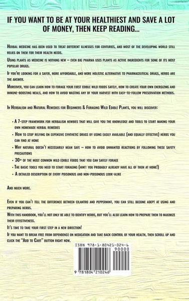If you want to be at your healthiest and save a lot of money, then keep reading... Herbal medicine has been used to treat different illnesses for centuries, and most of the developing world still relies on them for their health needs. Using plants as medicine is nothing new - even big pharma uses plants as active ingredients for some of its most popular drugs. If you're looking for a safer, more affordable, and more holistic alternative to pharmaceutical drugs, herbs are the answer. Moreover, you can learn how to forage your first edible wild foods safely, how to create your own energizing and immune-boosting meals, and how to avoid wasting any of your harvest with easy-to-follow preservation methods. In Herbalism and Natural Remedies for Beginners & Foraging Wild Edible Plants, you will discover: A 7-step framework for herbalism newbies that will give you the knowledge and tools to start making your own homemade herbal remedies How to stop relying on expensive synthetic drugs by using easily available (and equally effective) herbs you can find at home Why natural doesn't necessarily mean safe - how to avoid unwanted reactions by following these safety precautions 30+ of the most common wild edible foods that you can safely forage The basic tools you need to start foraging (hint: you probably already have all of them at home!) A detailed description of every poisonous and non-poisonous look-alike And so much more! Even if you can't tell the difference between cilantro and peppermint, you can still become adept at using and preparing herbs. With this handbook, you'll not only be able to identify herbs, but you'll also learn how to prepare them to maximize their effectiveness. It's time to take your first step in a new direction! If you want to break free from dependence on medication and take back control of your health, then scroll up and click the "Add to Cart" button right now.