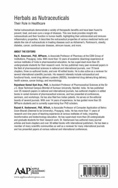 Raj K. Keservani, PhD, MPharm, is Associate Professor of Pharmacy at the CSM Group of Institutions, Prayagraj, India. With more than 12 years of academic (teaching) experience at various institutes of India in pharmaceutical education, he has supervised more than 25 undergraduate students for their research work. He has published many peer-reviewed papers in the field of pharmaceutical sciences in national and international journals, over 70 book chapters, three co-authored books, and over 40 edited books. He is also active as a reviewer for several international scientific journals. His research interests include nutraceutical and functional foods, novel drug delivery systems (NDDS), transdermal drug delivery/drug delivery, health science, cancer biology, and neurobiology. Rajeshwar Kamal Kant Arya, PhD, is Assistant Professor of Pharmaceutical Sciences at the Sir J.C. Bose Technical Campus Bhimtal of Kumaun University, Nainital, India. He has published over 25 research papers in national and international journals, has authored chapters in edited books in varied domains of pharmaceutical sciences, and has presented at conferences, seminars, and workshops. He has also filed two Indian patents. He serves on the editorial boards of several journals. With over 14 years of experience, he has guided more than 55 MPharm students and is currently supervising four PhD scholars. Rajesh K. Kesharwani, PhD, MTech, is Associate Professor of Computer Application at Nehru Gram Bharati (Deemed to be University), Prayagraj, India. He has more than 11 years of research and nine years of teaching experience at various institutes of India, imparting bioinformatics and biotechnology education. He has supervised more than 20 undergraduate and graduate students for their research work. Dr. Kesharwani has authored many journal articles and book chapters and over 30 edited books with international publishers. He has been a member of many scientific communities as well as a reviewer for many international journals and has presented papers at various national and international conferences.