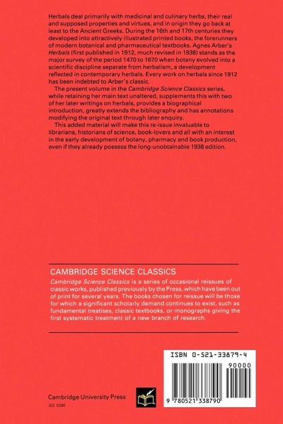 Herbals deal primarily with medicinal and culinary herbs, their real and supposed properties and virtues, and in origin they go back at least to the Ancient Greeks. During the 16th and 17th centuries they developed into attractively illustrated printed books, the forerunners of modern botanical and pharmaceutical textbooks. Agnes Arber's Herbals (first published in 1912, much revised in 1938) stands as the major survey of the period 1470 to 1670 when botany evolved into a scientific discipline separate from herbalism, a development reflected in contemporary herbals. Every work on herbals since 1912 has been indebted to Arber's classic. The present volume in the Cambridge Science Classics series, while retaining her main text unaltered, supplements this with two of her later writings on herbals, provides a biographical introduction, greatly extends the bibliography and has annotations modifying the original text through later enquiry. This added material will make this re-issue invaluable to librarians, historians of science, book-lovers and all with an interest in the early development of botany, pharmacy and book production, even if they already possess the long-unobtainable 1938 edition.