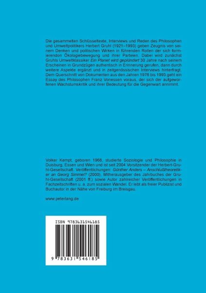 Die gesammelten Schlüsseltexte, Interviews und Reden des Philosophen und Umweltpolitikers Herbert Gruhl (1921-1993) geben Zeugnis von seinem Denken und politischen Wirken in führenden Rollen der sich formierenden Ökologiebewegung und ihrer Parteien. Dabei wird zunächst Gruhls Umweltklassiker Ein Planet wird geplündert 30 Jahre nach seinem Erscheinen in Grundzügen authentisch in Erinnerung gerufen, dann durch weitere Aspekte ergänzt und in zeitgenössischen Interviews hinterfragt. Dem Querschnitt von Dokumenten aus den Jahren 1976 bis 1993 geht ein Essay des Philosophen Franz Vonessen voraus, der sich der aufgeworfenen Wachstumskritik und ihrer Bedeutung für die Gegenwart annimmt.