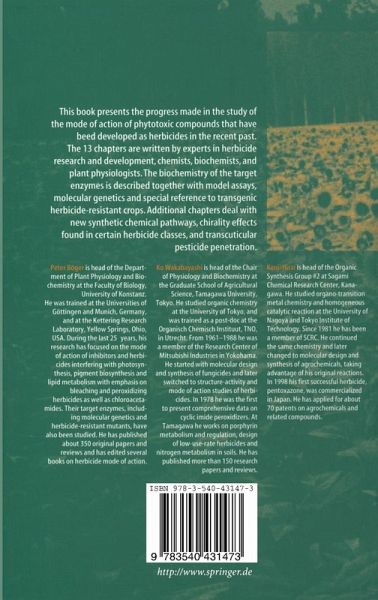 1 Acetolactate Synthase Inhibitors.- 1.1 Introduction.- 1.2 Acetolactate Synthase-Inhibiting Herbicides Actively Developed in the Late 1990s.- 1.3 Discovery of Pyrimidinyl Carboxy Herbicides (Pyrimidinylsalicylate Class Herbicides).- 1.4 Herbicidal Activity of Pyrimidinyl Carboxy Herbicides.- 1.5 Physiological Plant Response to Pyrimidinyl Carboxy Herbicides.- 1.6 Mode of Action and Selectivity of Pyrimidinyl Carboxy Herbicides.- 1.7 Biological Characteristics of the Target Enzyme.- 1.8 Inhibition Mechanism of the Target Enzyme by Pyrimidinyl Carboxy Herbicides.- 1.9 Molecular Genetics of Target Enzyme.- References.- 2 Bleaching Herbicides: Action Mechanism in Carotenoid Biosynthesis, Structural Requirements and Engineering of Resistance.- 2.1 Herbicidal Effect and Mode of Action.- 2.2 Interaction of Inhibitors with Carotene Desaturation.- 2.3 Structural Requirements for an Inhibitor of Phytoene Desaturase.- 2.4 Strategies for Genetic Engineering of Herbicide Resistance by Modification of the Carotenogenic Pathway.- 2.5 Conclusion and Perspectives.- References.- 3 Inhibitors of Aromatic Amino Acid Biosynthesis (Glyphosate).- 3.1 Introduction.- 3.2 Symptoms of Herbicidal Activity.- 3.3 Mode of Action of Glyphosate.- 3.4 Mechanisms for Resistance and Tolerance to Glyphosate.- 3.5 Summary.- References.- 4 Inhibitors of Glutamine Synthetase.- 4.1 Introduction.- 4.2 Plant Glutamine Synthetase Isoforms and Their Function.- 4.3 Glutamine Synthetase Inhibitors.- 4.4 Discovery of the Herbicidal Activity of Phosphinothricin and Bialaphos.- 4.5 Mode of Glutamine Synthetase Inhibition.- 4.6 Effects of Glutamine Synthetase Inhibitors in Plants.- 4.7 Attempts to Generate Selectivity for Glufosinate.- References.- 5 Acetyl-CoA Carboxylase Inhibitors.- 5.1 Introduction.- 5.2 Symptoms of Herbicidal Activity.- 5.3 Biochemical Characteristics of the Target Enzyme.- 5.4 Mode of Action of Cyclohexanedione and Aryloxyphenoxypropanoate Herbicides.- 5.5 Assays for Acetyl-CoA Carboxylase Activity.- 5.6 Molecular Genetics of Resistance to Acetyl-CoA Carboxylase Inhibitors.- References.- 6 Inhibitors of Biosynthesis of Very-Long-Chain Fatty Acids.- 6.1 Introduction.- 6.2 The Model System.- 6.3 Very Long-Chain Fatty Acid Biosynthesis Inhibition in Intact Leaves.- 6.4 The Cell-Free Elongase System.- 6.5 Assumptions of the Reaction Mechanism.- 6.6 Considerations on Resistance.- References.- 7 Cellulose Biosynthesis Inhibitor Herbicides.- 7.1 Introduction.- 7.2 Mode of Action Studies.- 7.3 Resistant Biotypes.- 7.4 Habituation.- 7.5 The Unusual Case of Quinclorac.- 7.6 Conspectus.- References.- 8 Inhibitors of Protoporphyrinogen Oxidase: A Brief Update.- 8.1 Introduction.- 8.2 Protoporphyrinogen Oxidase Inhibitors and Their Mode of Action.- 8.3 Biochemical Characterization of Protoporphyrinogen Oxidase.- 8.4 Protoporphyrinogen Oxidase Genes and Transgenic Herbicide-Resistant Plants.- 8.5 Recent Advances in QSAR Studies.- 8.6 Antioxidative Stress Responses of Plants to Protoporphyrinogen Oxidase Inhibitors.- References.- 9 Genetic Engineering of Herbicide-Resistant Plants.- 9.1 Introduction.- 9.2 Strategy.- 9.3 Cloning of the Genes.- 9.4 Gene Transfer.- 9.5 Vector Constructs.- 9.6 Conclusions.- References.- 10 Major Synthetic Routes for Modern Herbicide Classes and Agrochemical Characteristics.- 10.1 Introduction.- 10.2 Acetolactate Synthase Inhibitors.- 10.3 Carotenogenesis Inhibitors.- 10.4 Aromatic Amino Acid Biosynthesis Inhibitors.- 10.5 Glutamine Synthetase Inhibitors.- 10.6 Acetyl CoA Carboxylase (ACCase) Inhibitors.- 10.7 Very Long-Chain Fatty Acids Biosynthesis Inhibitors.- 10.8 Cellulose Biosynthesis Inhibitors.- 10.9 Protoporphyrinogen-IX Oxidase Inhibitors.- 10.10 Notes.- Patent Literature.- 11 Diverse Response of Plants Towards Chiral Phytotoxic Chemicals.- 11.1 Introduction.- 11.2 Diverse Response of Optically Active Herbicides.- 11.3 Diverse Response of Plants Through Chirality.- 11.4 Chirality and Activity Relationship.- References.- 12 Transcuticular Penetration of Foliar-Applied Pesticides - Its Analysis by a Logistic-Kinetic Penetration Model.- 12.1 Introduction.- 12.2 Overview.- 12.3 Logistic-Kinetic Transcuticular Penetration Model of Foliar-Applied Pesticides.- 12.4 Parameters and Factors Governing Transcuticular Penetration Kinetics of Foliar-Applied Pesticides.- 12.5 Effects of Adjuvants on Transcuticular Penetration Kinetics of Foliar-Applied Pesticides.- 12.6 Discussion and Conclusions.- References.- 13 Structure-Activity Correlation of Very Long-Chain Fatty Acid Biosynthesis Inhibitors.- 13.1 Introduction.- 13.2 Very Long-Chain Fatty Acid Biosynthesis Inhibition by Herbicides.- 13.3 Very Long-Chain Fatty Acid Biosynthesis Inhibition by Thenylchlor and Its Analogs.- 13.4 Action of Cafenstrole and its Analogs.- 13.5 Action of Indanofan and its Analogs.- 13.6 Outlook.- References.