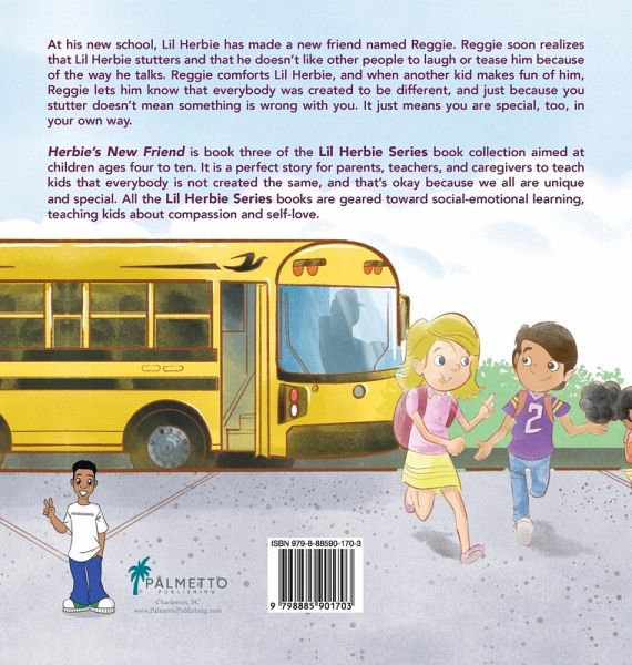 At his new school, Lil Herbie has made a new friend named Reggie. Reggie soon realizes that Lil Herbie stutters and that he doesn't like other people to laugh or tease him because of the way he talks. Reggie comforts Lil Herbie, and when another kid makes fun of him, Reggie lets him know that everybody was created to be different, and just because you stutter doesn't mean something is wrong with you. It just means you are special, too, in your own way. Herbie's New Friend is book three of the Lil Herbie Series book collection aimed at children ages four to ten. It is a perfect story for parents, teachers, and caregivers to teach kids that everybody is not created the same, and that's okay because we all are unique and special. All the Lil Herbie Series books are geared toward social-emotional learning, teaching kids about compassion and self-love.