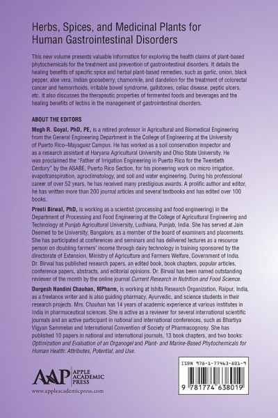 Part I: Natural Phytochemicals in Gastrointestinal Disorders 1. Ethnopharmacology and Therapeutic Potential of Carica Papaya 2. Therapeutic Activities of Nutmeg (Myristica fragrans) 3. Plant-Based Phytochemicals in the Prevention of Colorectal Cancer 4. Role of Medicinal Plants in the Treatment of Hemorrhoids Part II: Role of Spices and Herbs in the Management of Gastrointestinal Disorders 5. Health Benefits of Garlic (Allium sativum) in Gastrointestinal Disorders 6. Role of Onion (Allium cepa) in Gastrointestinal Disorders 7. Role of Lectins in Gastrointestinal Disorders 8. herapeutic Efficacy of Black Pepper in Gastrointestinal Disorders 9. Curative Properties of Chamomile in Gastrointestinal Disorders 10. Pharmacology and Therapeutics of Dandelion in Gastrointestinal Disorders Part III: Plant-Based Remedies in the Treatment of Gastrointestinal Diseases 11. Role of Aloe vera in Irritable Bowel Disease 12. Herbal Treatment for Irritable Bowel Syndrome 13. Role of Plant-Based Medicines for Gallstones 14. Potential of Pseudocereals in Celiac Disease 15. Role of Amla (Emblica officinalis) in Peptic Ulcer 16. Therapeutic Properties of Fermented Foods and Beverages
